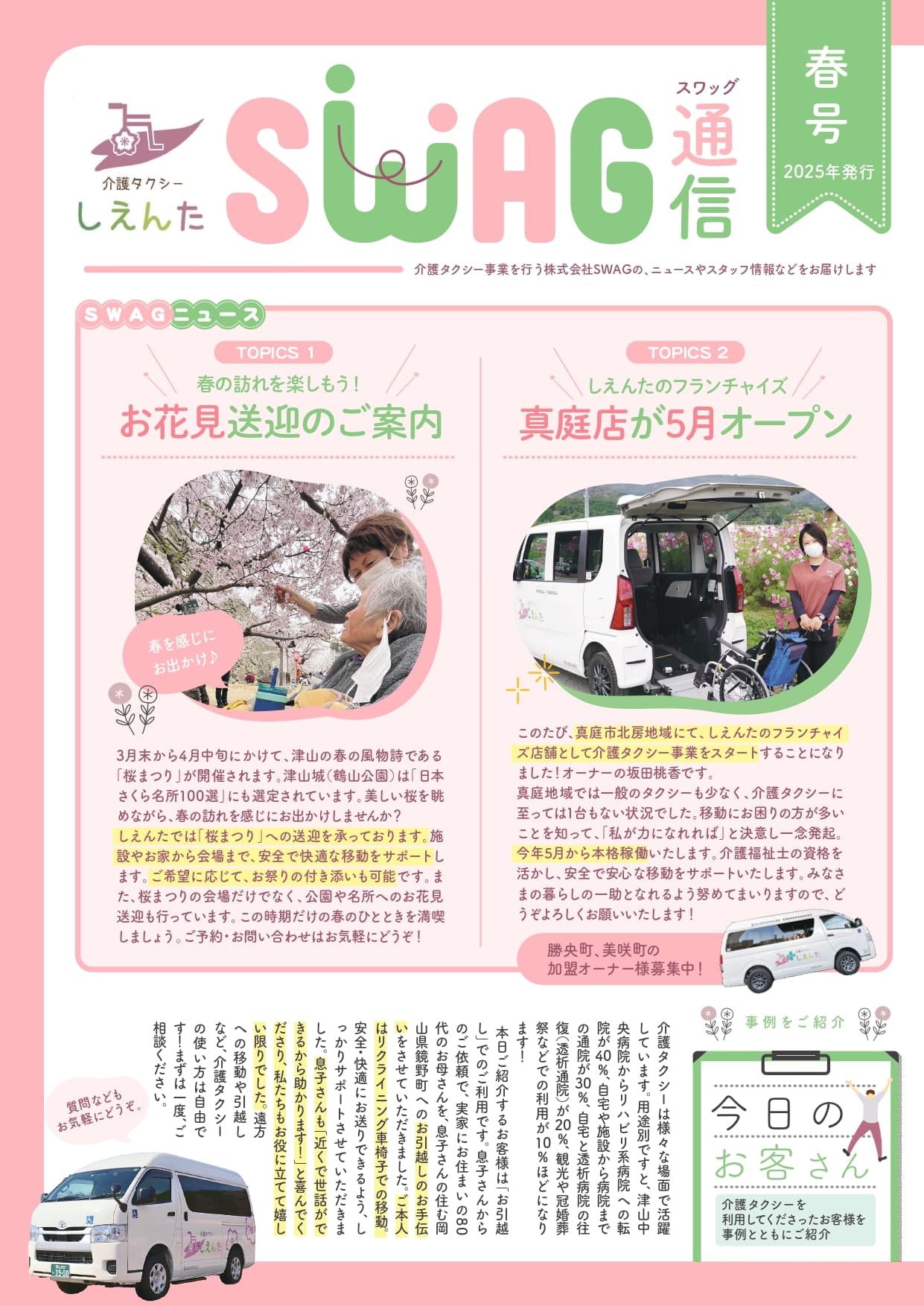 今回はお花見送迎のご案内や5月にオープンする真庭支店の模様をお届けします。
